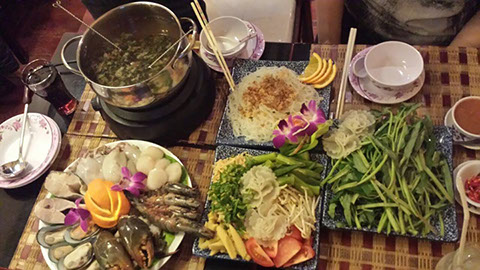( Coquille StJacques , Scampis, Calamars, Boeuf,Poulet, Porc, Oeufs, Nouilles, Vermicelles, Légumes variés )