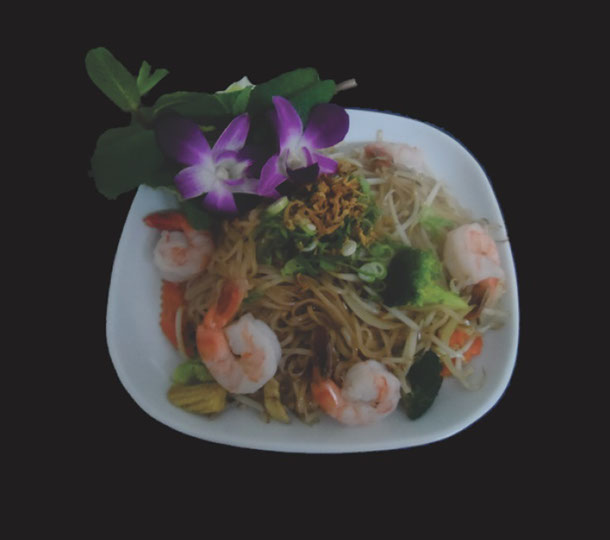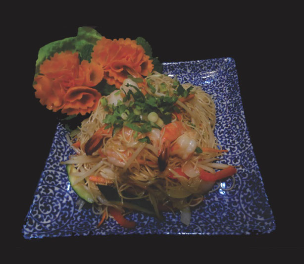 - Pâtes de riz sautées aux viandes mixtes et scampis THAI